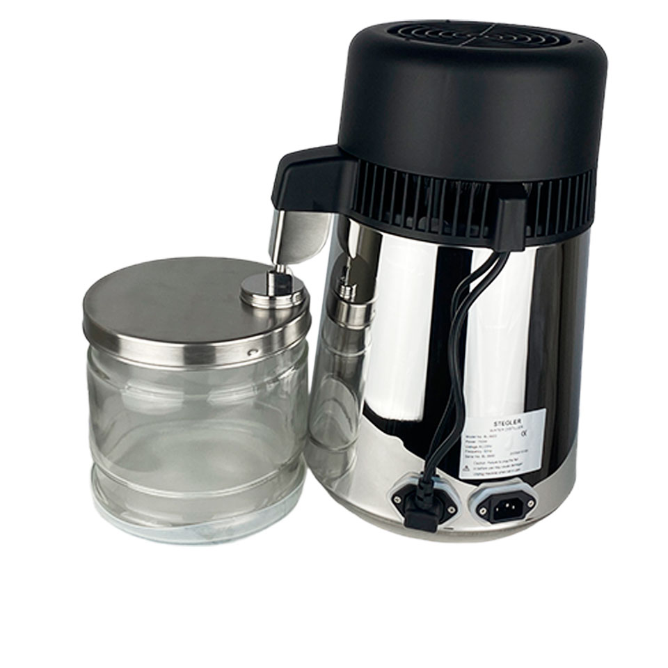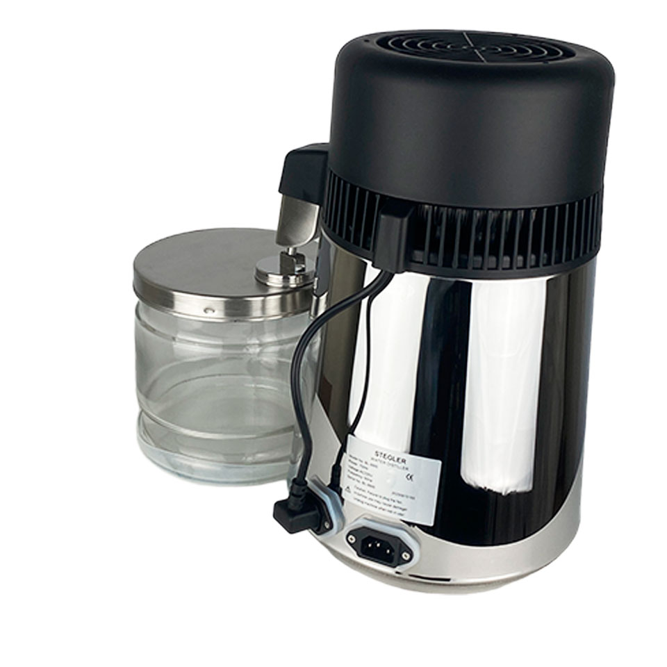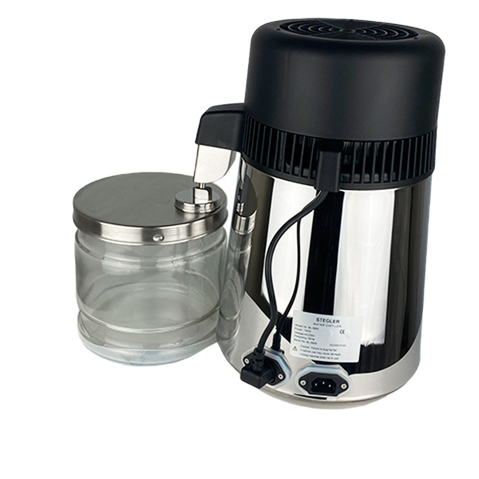 Аквадистиллятор Stegler BL−9900 со стеклянным приёмником — настольный прибор для получения дистиллированной воды в домашних условиях, небольших лабораториях, аптеках и отделениях больниц. Корпус выполнен из металла, водосборник — из стекла.