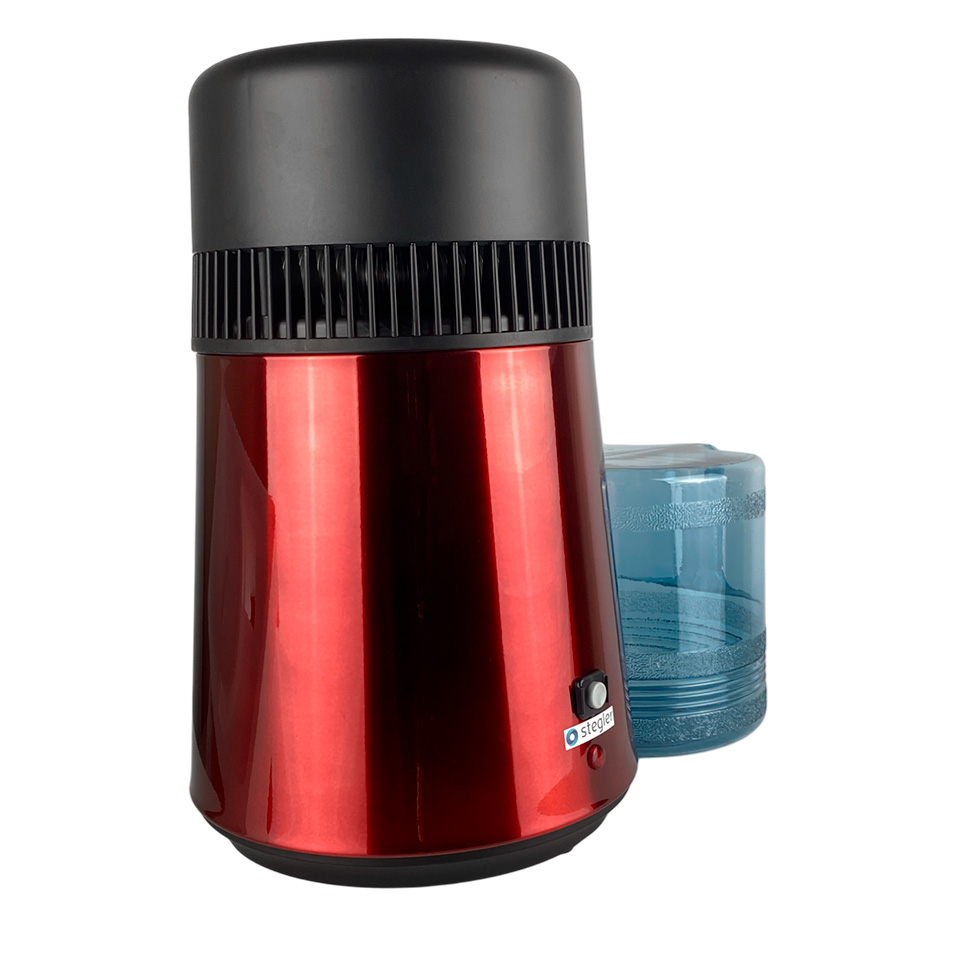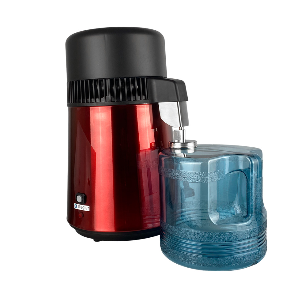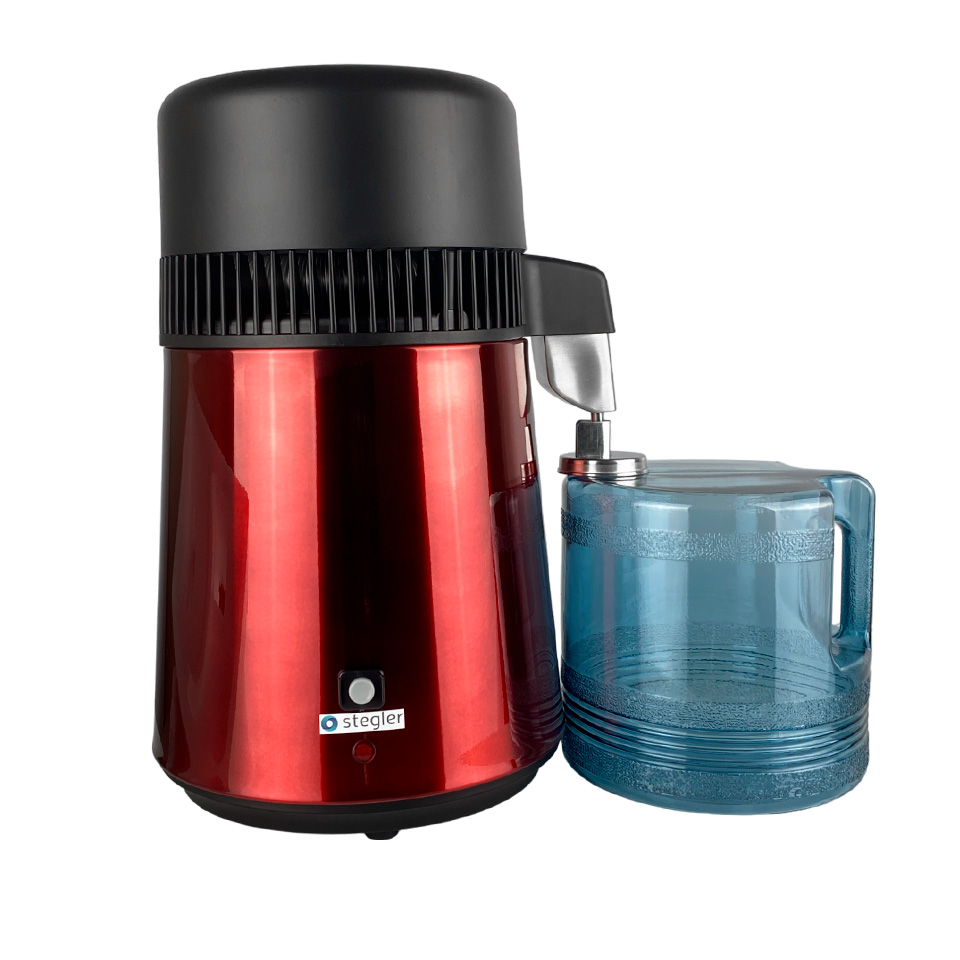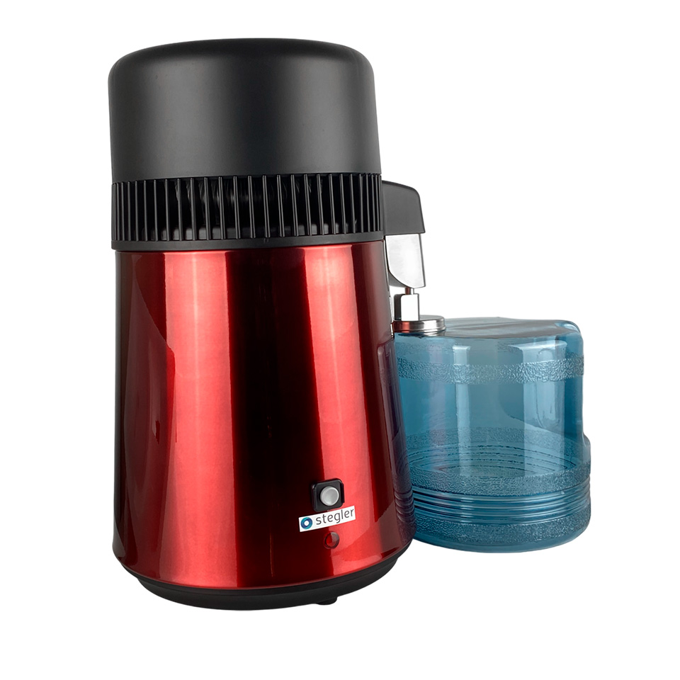 Бытовой настольный аквадистиллятор Stegler BL−9901 с пластиковым приёмником — устройство для получения дистиллированной воды в домашних условиях, небольших лабораториях, аптеках и отделениях больниц. Корпус выполнен из красного металла, водосборник — из пластика.