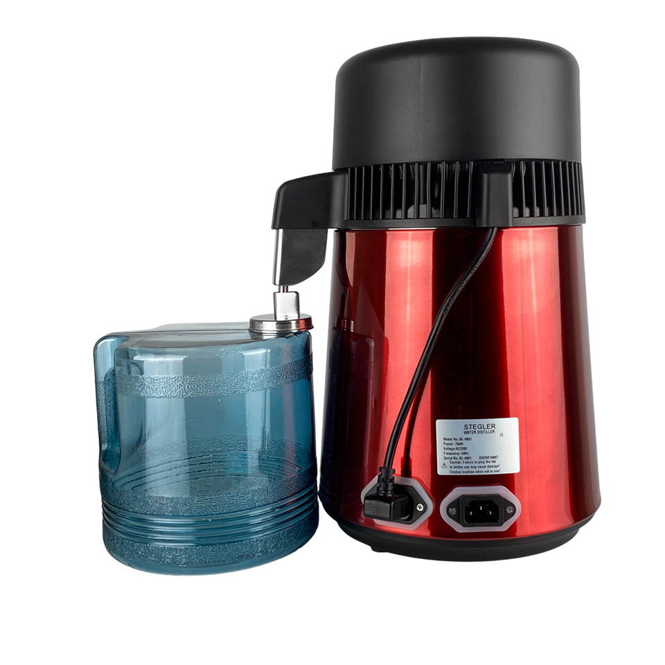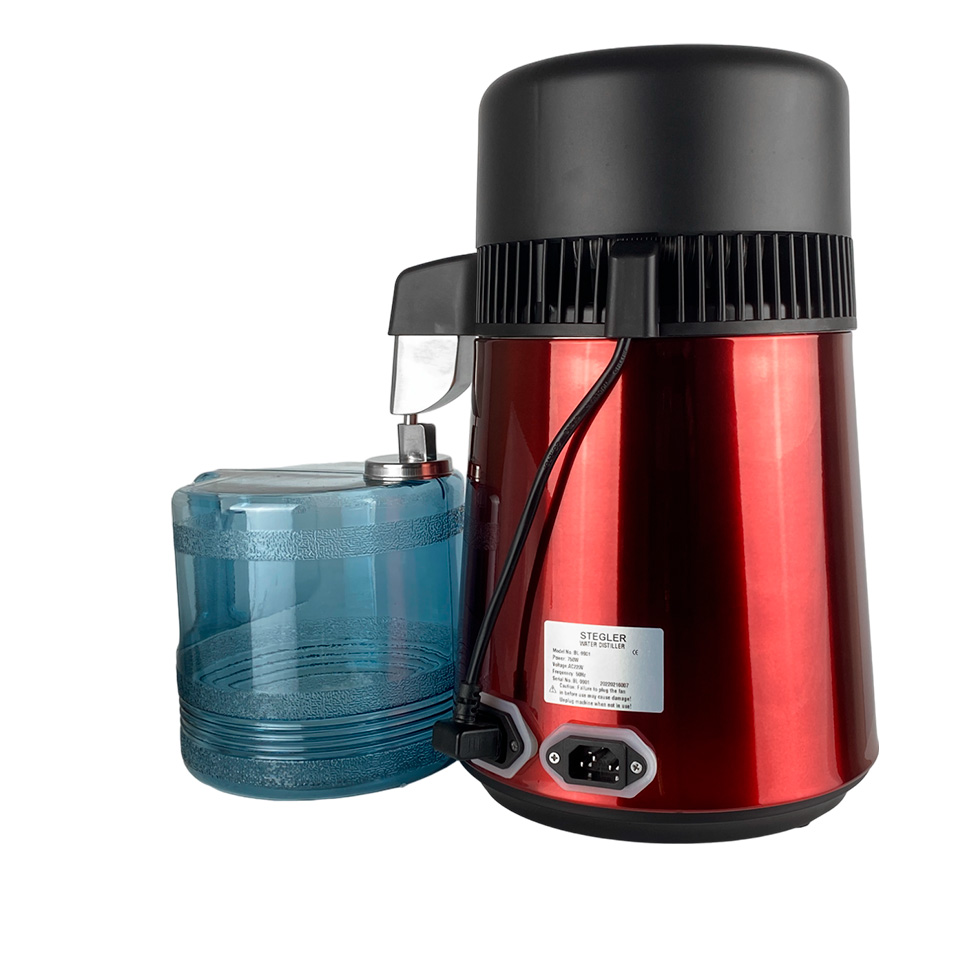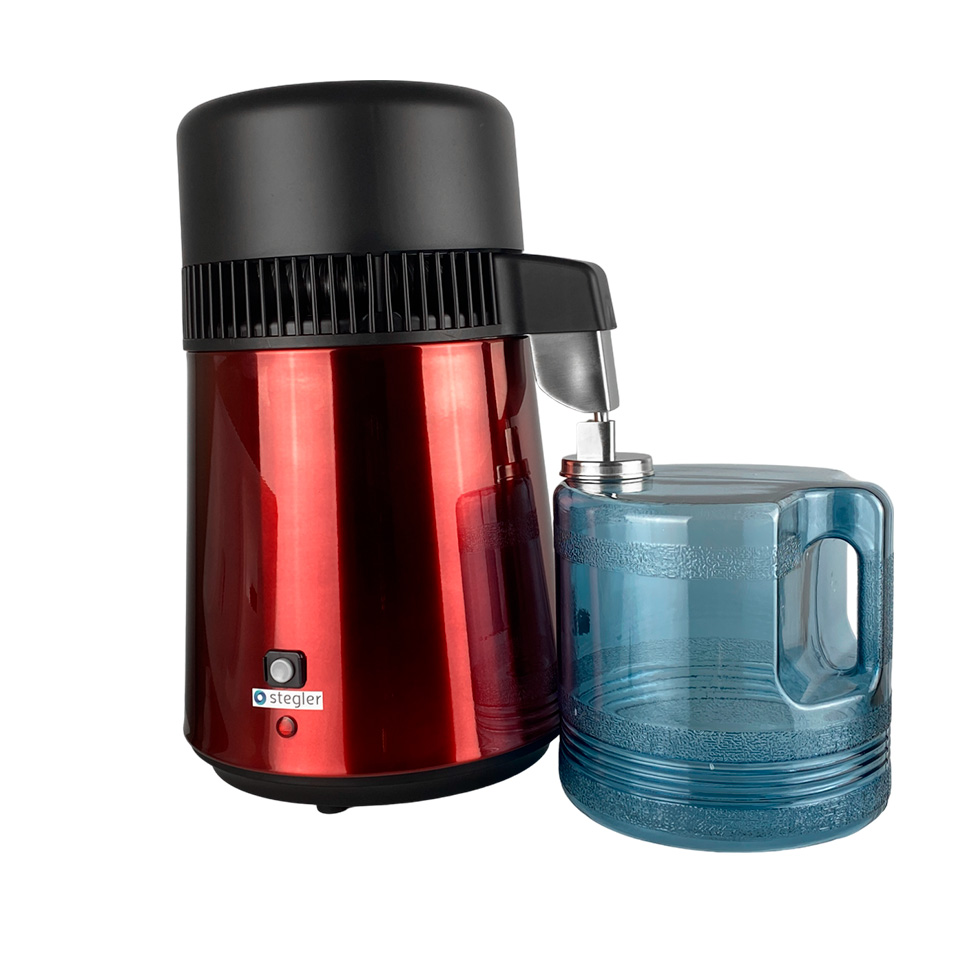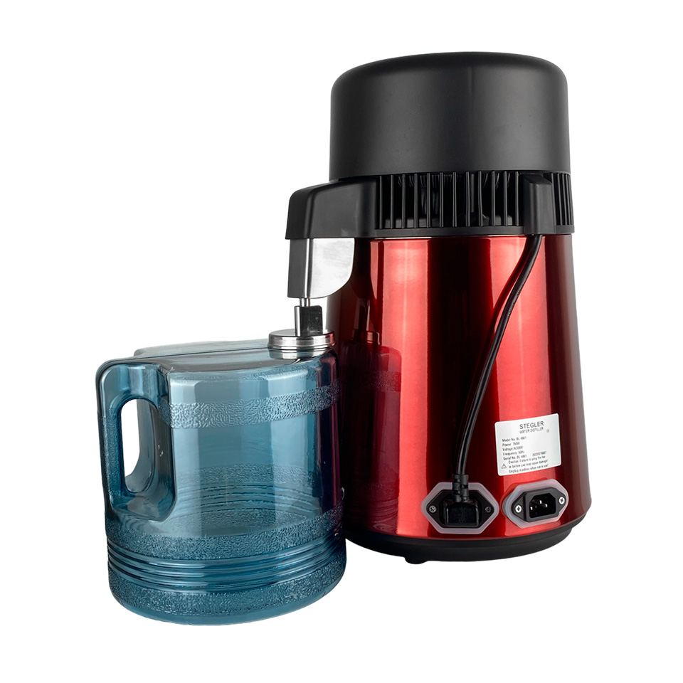 Бытовой настольный аквадистиллятор Stegler BL−9901 с пластиковым приёмником — устройство для получения дистиллированной воды в домашних условиях, небольших лабораториях, аптеках и отделениях больниц. Корпус выполнен из красного металла, водосборник — из пластика.