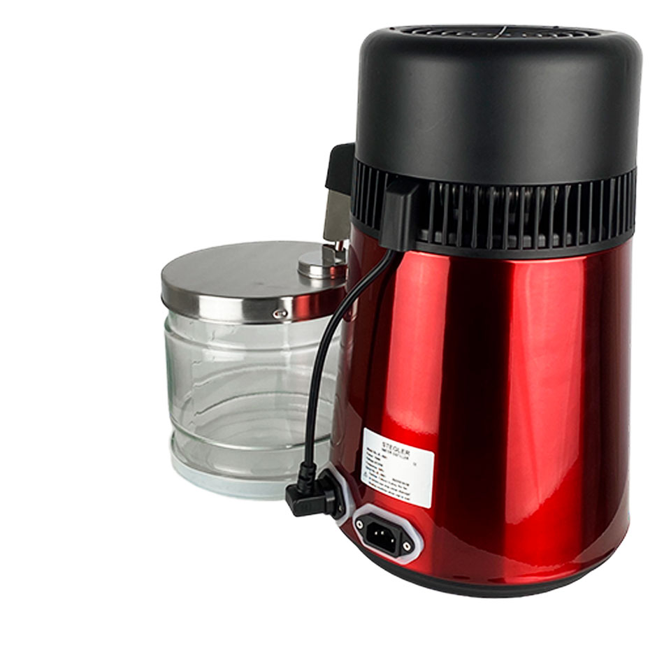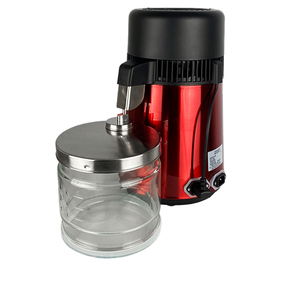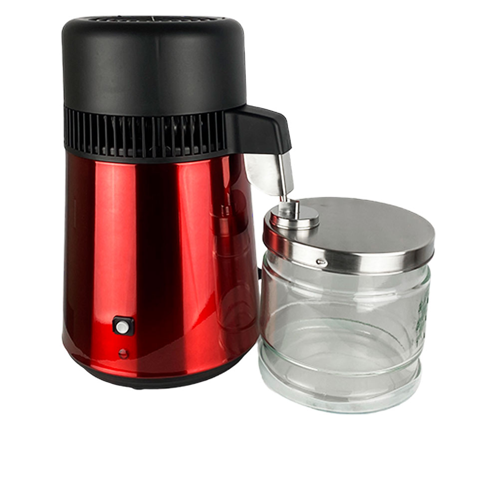 Корпус аквадистиллятора выполнен из металла, приёмник — из прочного стекла. Вода проходит дополнительную очистку через угольный фильтр, который рекомендуется заменять каждые 3–5 месяцев в зависимости от интенсивности использования. Автоматическое отключение питания при достижении температуры свыше 160 °С гарантирует безопасность работы. Устройство легко размещается на столе и занимает минимум места.