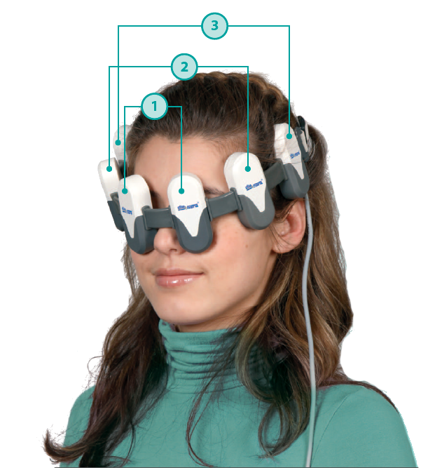 - Три пары индукторов для комплексного воздействия на глазное яблоко, височную область и проводящие пути зрительного анализатора.