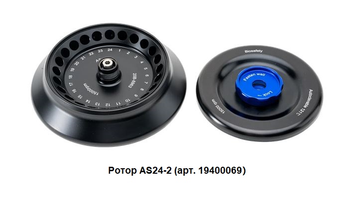 - Ротор AS24−2 из алюминиевого сплава, выдерживает 15 000 об/мин, максимальный RCF 21380 × g, вместимость: 24 пробирки объёмом 2 мл, 1,5 мл, 0,5 мл или 0,2 мл.