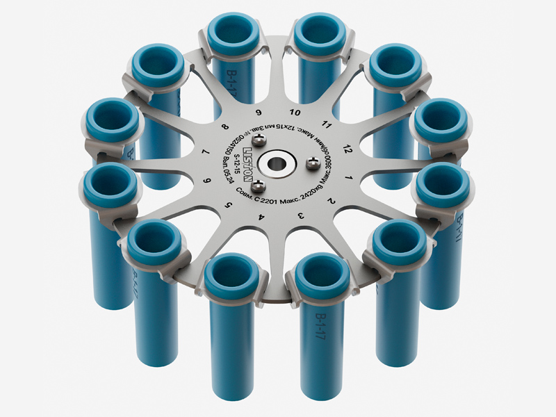 Ротор позволяет центрифугировать пробирки Ø до 17 мм и высотой до 112 мм. Возможно применение вставок для центрифугирования пробирок меньшей высоты.