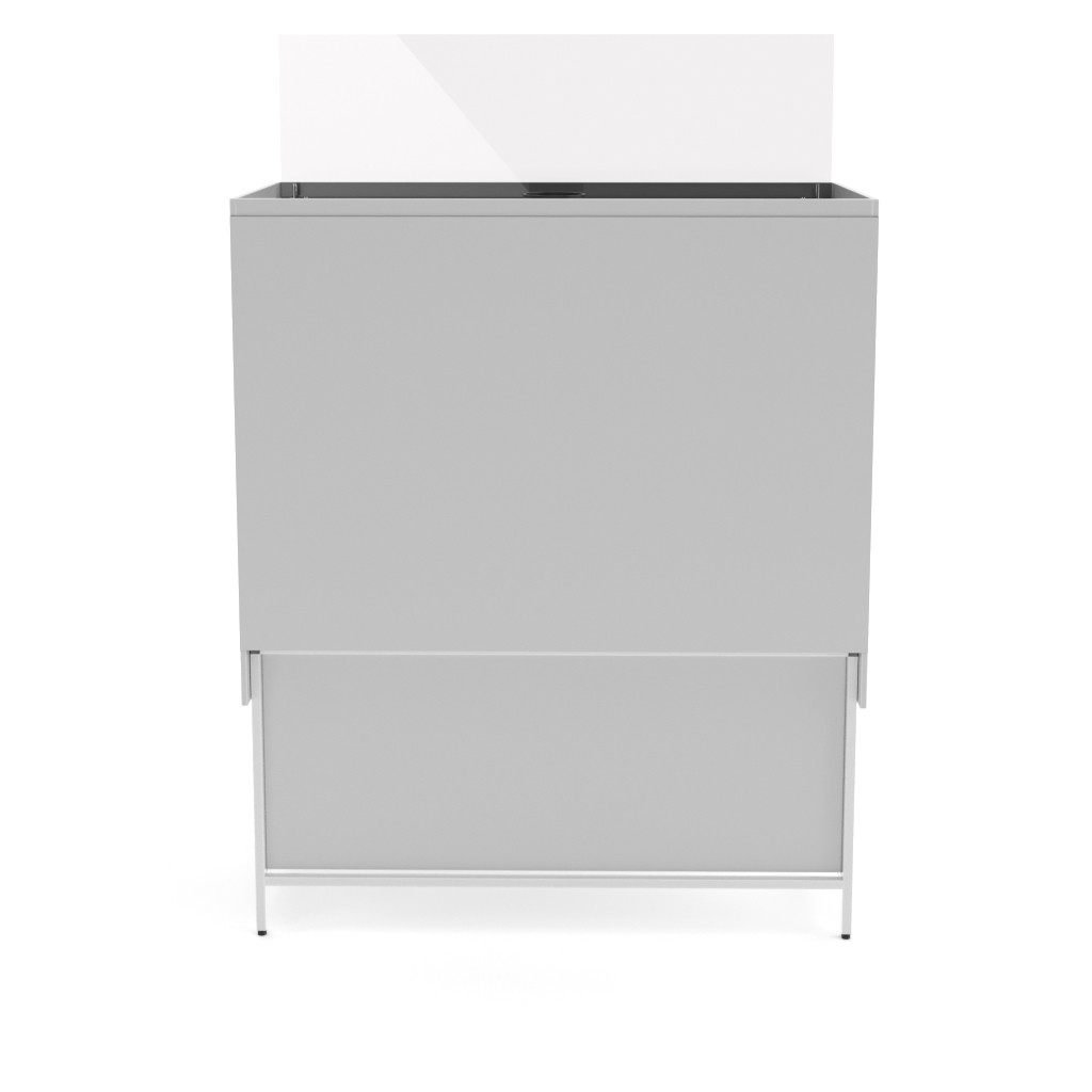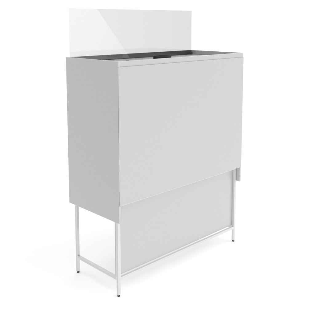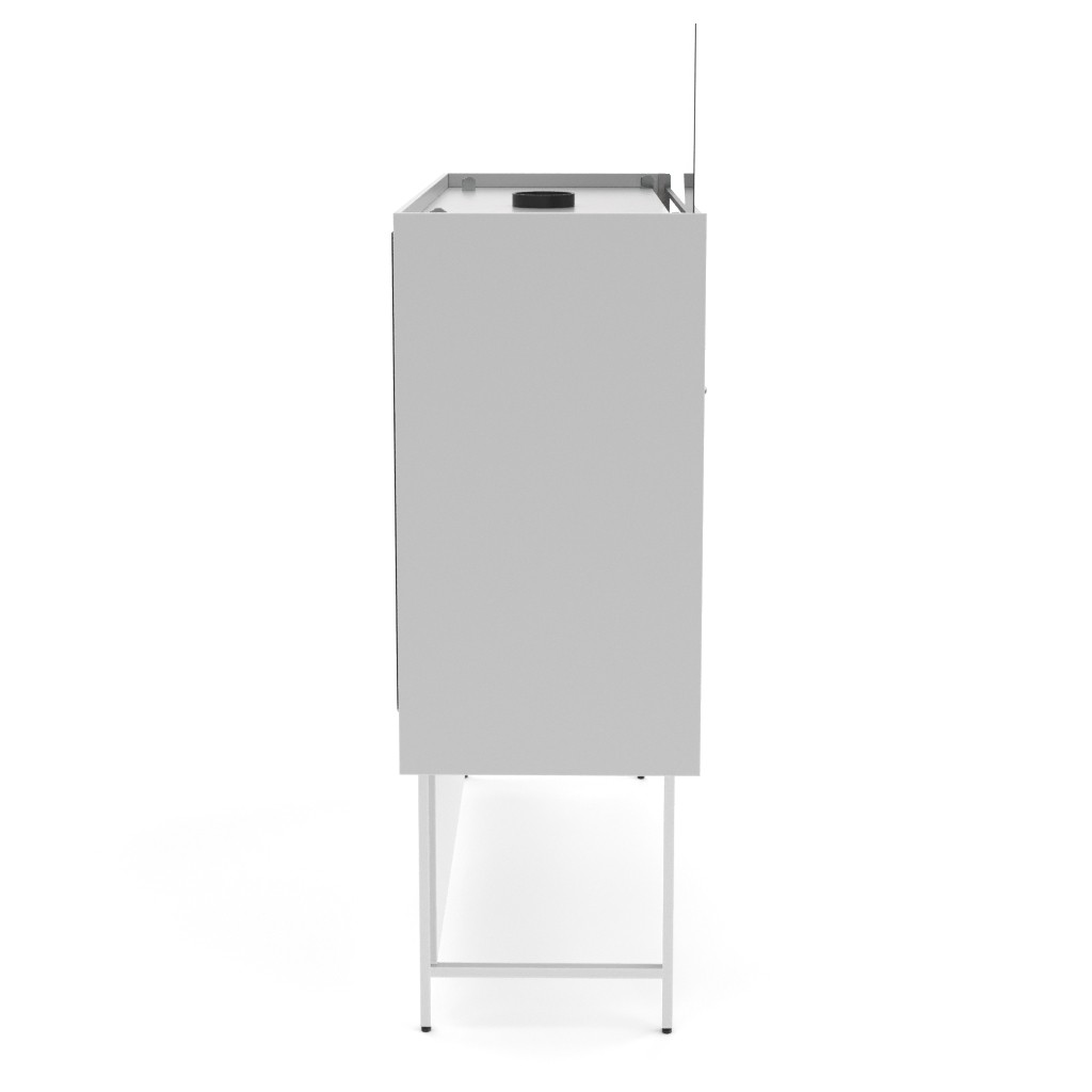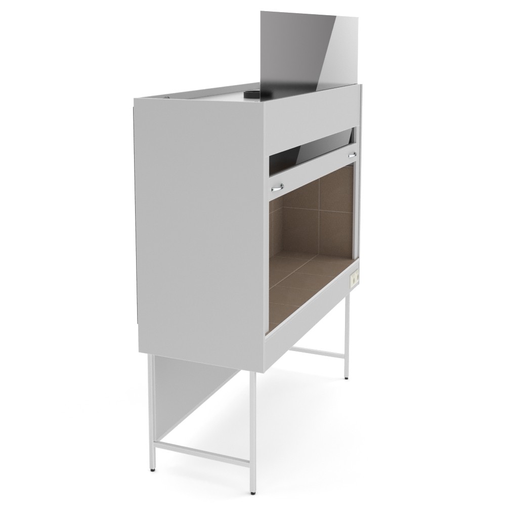 Рабочая зона закрывается двумя подъёмными рамами с противовесом, обеспечивая удобный доступ к оборудованию. Высота поднятого стекла над шкафом составляет 510 мм, общая высота шкафа при поднятом стекле — 2 470 мм. Две зоны вытяжки — купол вытяжного бокса и уровень столешницы — обеспечивают эффективное удаление вредных паров.